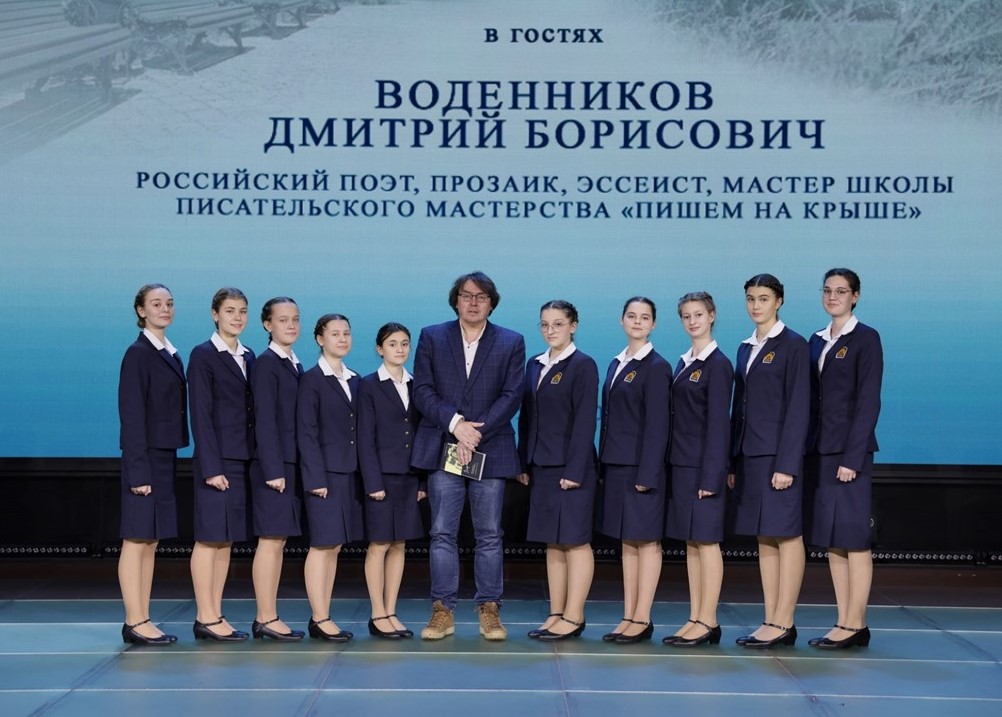Лауреат премии «Книга года», обладатель Гран-при национальной литературной премии «Поэт года» Дмитрий Борисович Воденников начал творческую встречу с философской мысли о том, что каждый человек, замечая всё происходящее вокруг себя, формирует образ собственного будущего. Поэт отметил, что будущее вариативно, мы не можем его предугадать, но можем его создавать, и каждый может увидеть случайное происшествие как символическое действие. Обращаясь к воспитанницам, гость отметил: «…Как будто бесконечный, непредставимый, упирающийся одним концом в Большой взрыв, …вот сейчас, именно сейчас, под нашими ногами, за нашей спиной мир прирастает прошлым. Даже когда вы пишете сочинение, вы преобразуете этот мир».