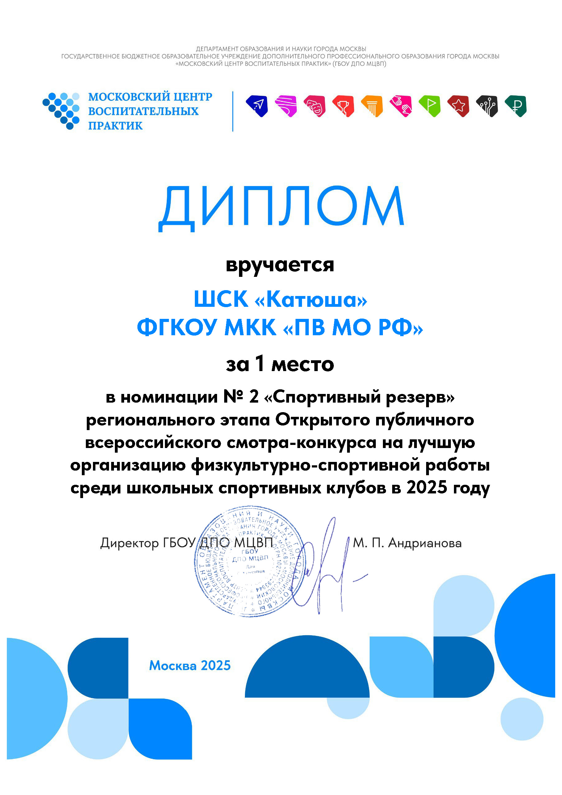 Спортивный клуб Пансиона воспитанниц МО РФ «Катюша» признан лучшим школьным спортивным клубом Москвы в номинации «Спортивный резерв»