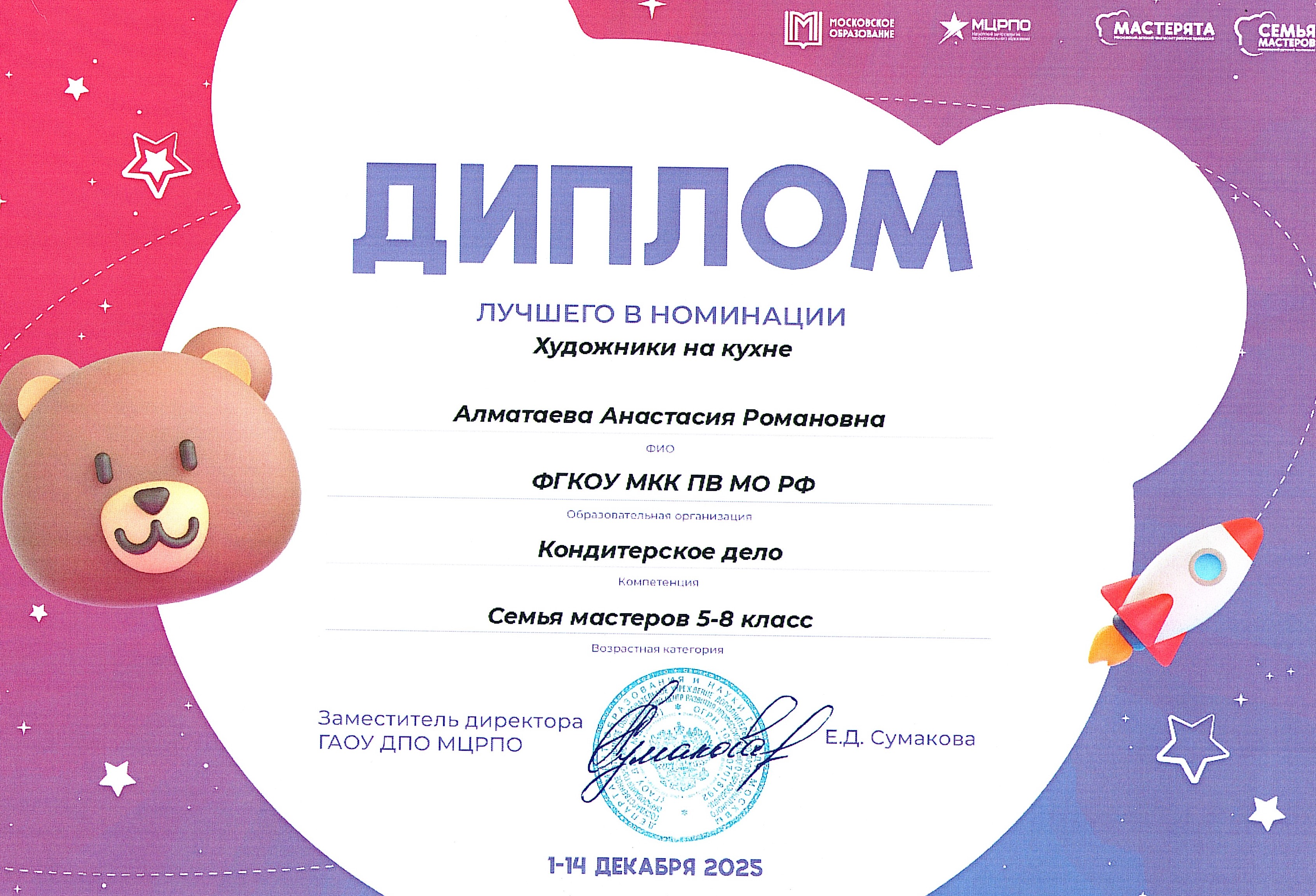 В категории «Кондитерское дело» воспитанница представила технологию приготовления трёхслойного чизкейка, в оформлении которого, согласно требованию конкурса, была отражена тема «Цирковое искусство».
