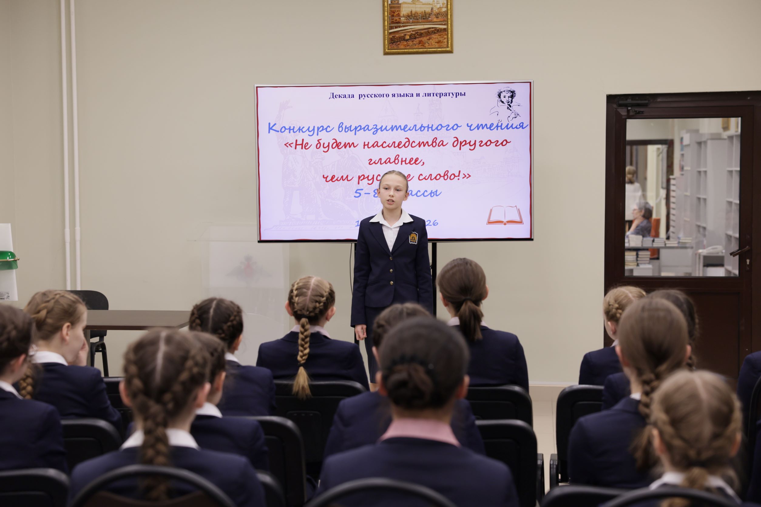 Ежегодным мероприятием предметной декады «Русский язык и литература» стал конкурс выразительного чтения. В этом году соревнование юных чтецов проходит под девизом: «Не будет наследства другого главнее, чем русское слово!». В первый конкурсный день в ораторском искусстве состязались представители 5-х, 6-х и 7-х классов. Воспитанницы исполнили стихи Р. Рождественского, Ю. Друниной, Г. Шпаликова, А. Дементьева, Е. Евтушенко и других известных российских поэтов.